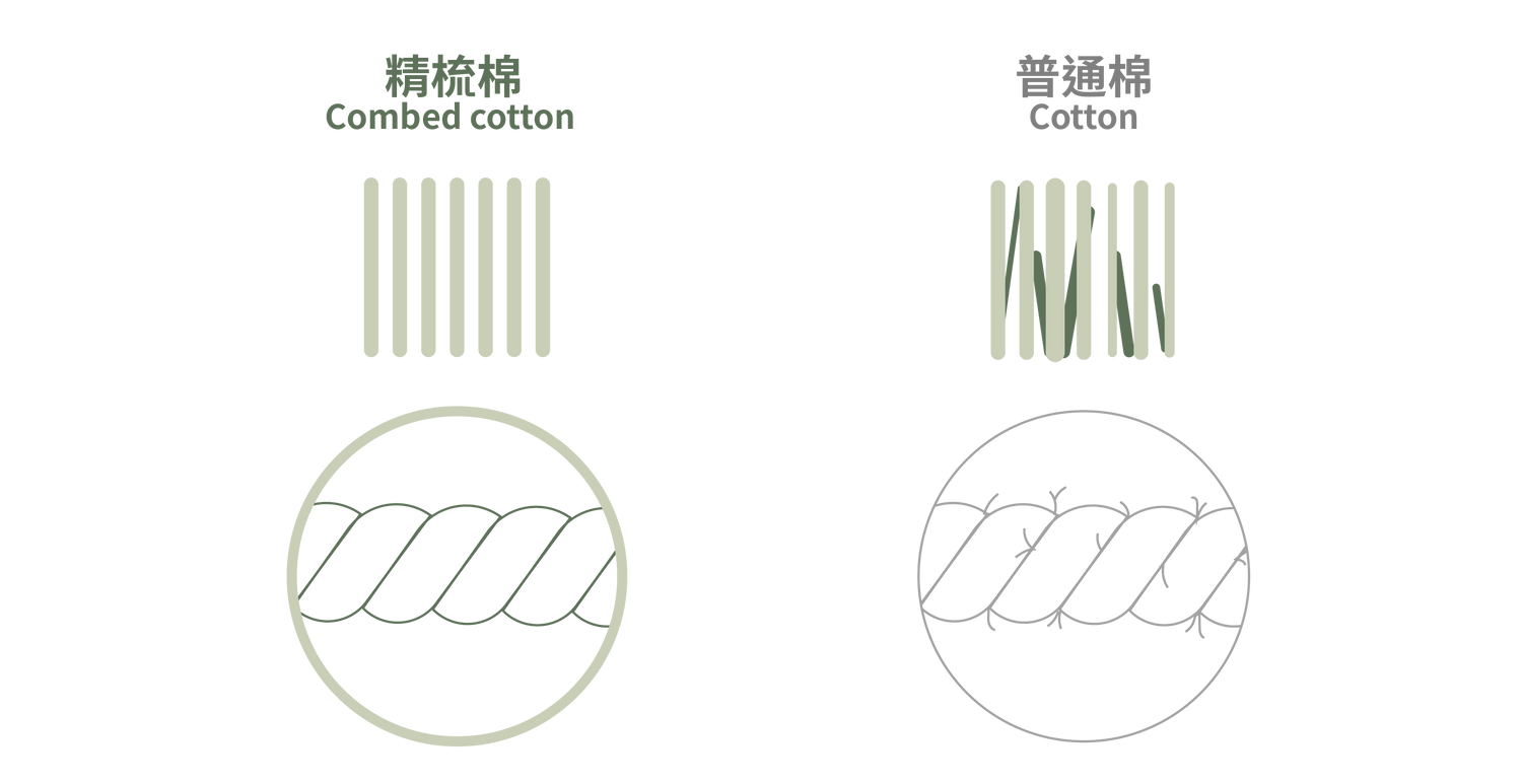 與一般純棉紡織品相比,精梳棉會有額外工序步驟。 在紡紗的過程中我們會以精梳機去除較短的棉花纖維和雜質,留下較長及整齊的纖維,所以精梳棉的產品質地較細,更平滑有韌性,不容易起球,品質較佳。