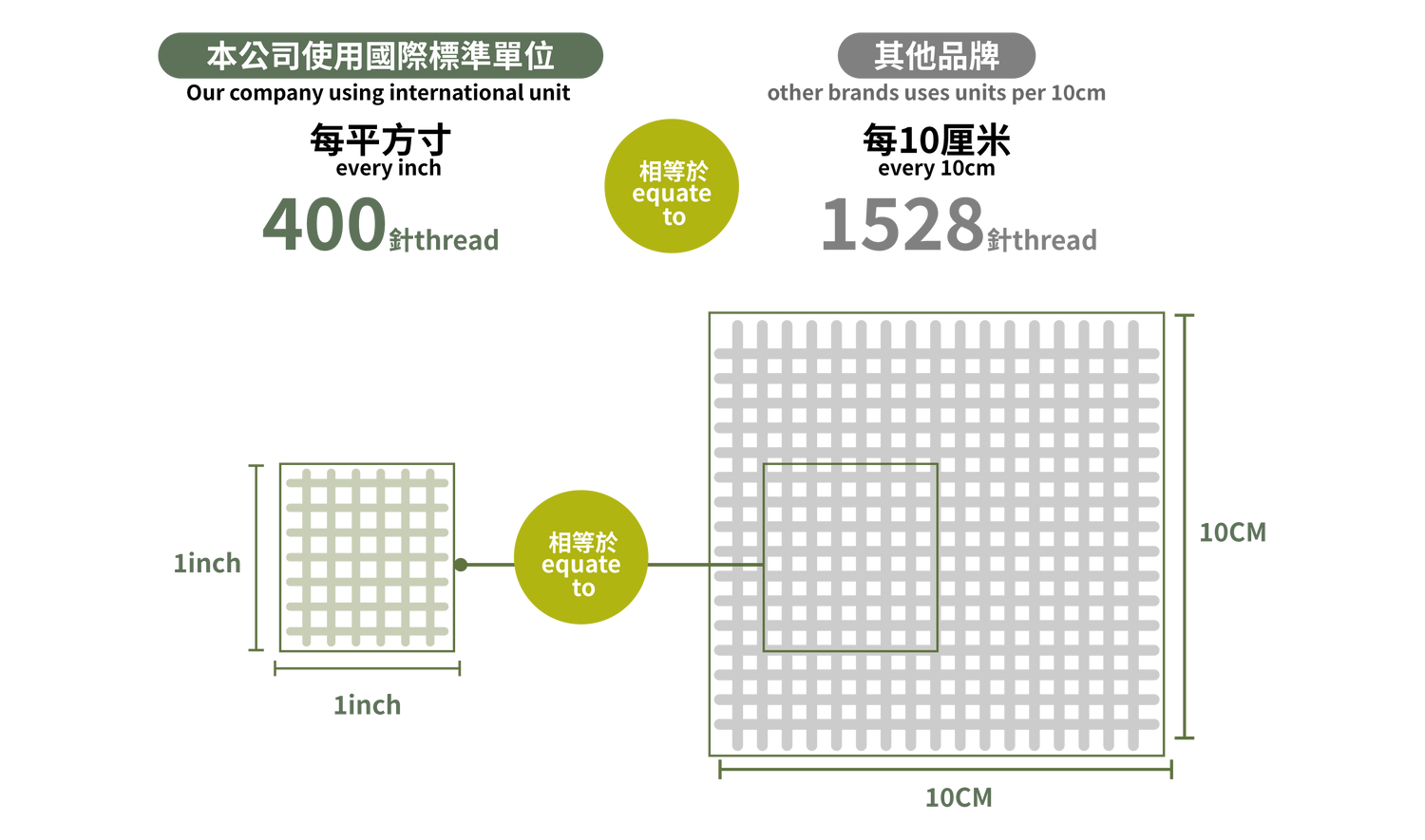 床單針數越高一定越好?市面上各品牌會以不同單位標示針數,包括每10厘米/每15厘米/ 每10平方英吋,【以較大的量度面積計算】令針數倍增,使數字看似更吸引,或會令消費者誤解床品的實際針數