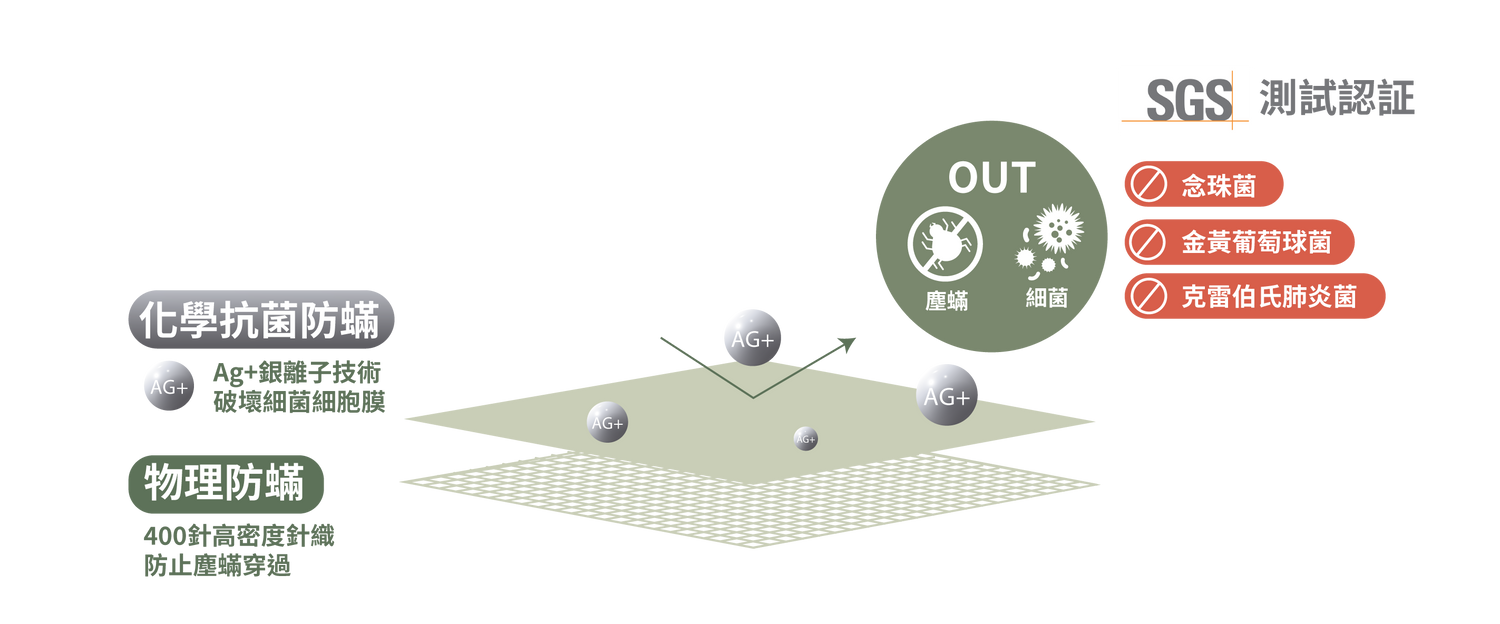 人體睡眠時所釋出的濕氣及汗水,容易讓床上有細菌及麈蟎滋生,有機會引致鼻敏感或皮膚痕癢等過敏反應。 採用 Active Fresh 銀離子抗菌技術,有效抑制細菌生長,並在抗蟎活動測試中表現優異。